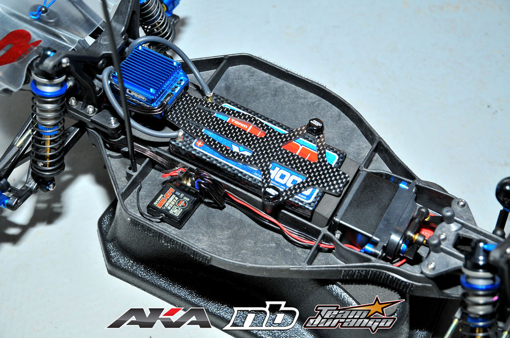 Looks like Cav is using titanium screws in places along with a carbon top plate. I’m surprised that AE hasn’t updated the chassis mold to include slots or holes to slide your servo and transponder wires through yet. Check out Cav’s custom holes in his chassis to further clean up the wiring making it neat and tidy.