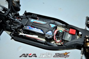 With a great picture of the chassis, you can see that Jared has gone full shorty pack for this race instead of the optional WTS or full pack. When the grip is good, shorty packs just accelerate so much better because of the lightness of the car. He is also running a full size servo, the mighty KO RSx servo. The layout is streamline and everything that’s got a bit of meat is mounted down the center line. By running the shorty pack, he is now able to mount his receiver right behind his servo to keep everything nice and tidy and avoid cluster bombing the side rails. I’ve gotten a lot of questions about Jared’s battery brace. I believe it is the prototype batt brace and he’s just using it b/c it’s different than what everyone else has. I don’t it being more functional. Personally, I think it looks worse than the stock brace so I’m not that interested.
