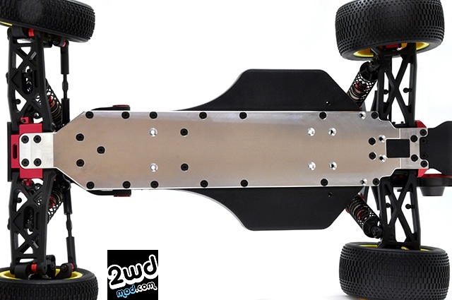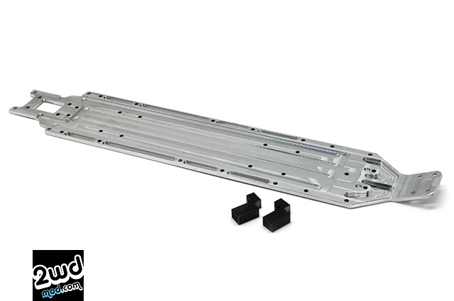 The CNC machined high precision and high rigidity aluminum main chassis for the Team Durango DEX210 was born in collaboration with MotogoSeiki. This clear anodized aluminum (A7075) long wheel base chassis is 17g lighter than kit standard one even it has +10mm longer length and also is 1.0mm thicker with more rigidity and durability, which gives more traction to the car. This special chassis gives you more stability during running and jumping also it give you more steering performance.