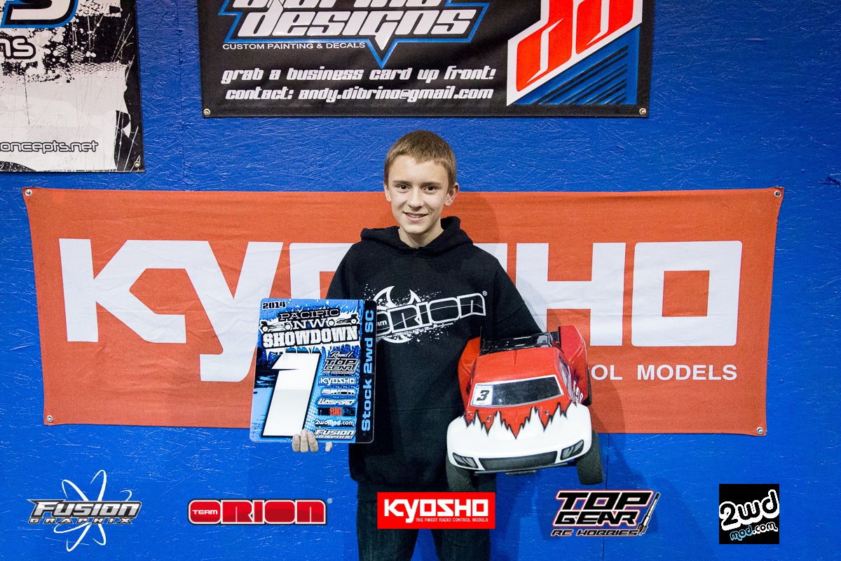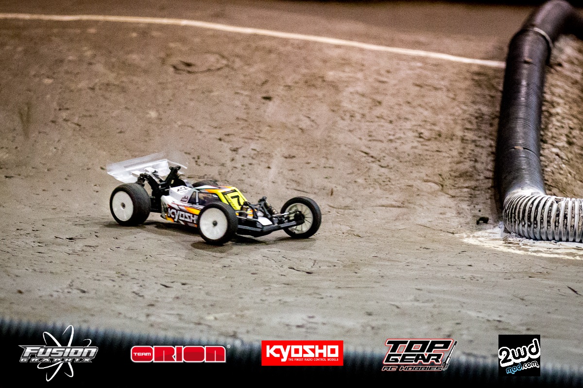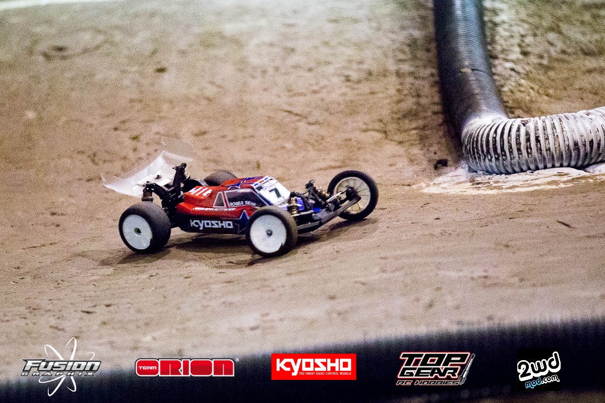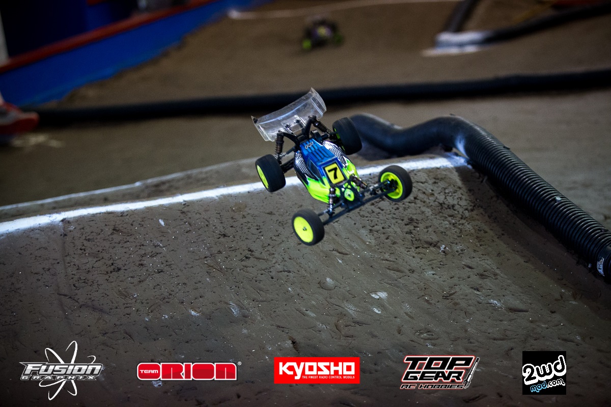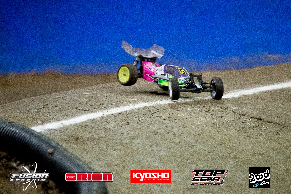 Qualifying was very close, but shining through the pack was Team Kyosho/Orion’s Andy DiBrino setting the only 19 lap runs throughout the three rounds of qualifying. Shaun Dunlap, running a C4.2, was close on his heels running just 1.2 seconds shy of a 19 lap run. In watching all 2wdmod rounds of qualifying, Shaun wasn’t unable lay down a perfectly clean run and had a few minor bobbles and lap traffic playing a factor. Kyosho/Orion’s team manager, Joe Pillars, took the time out of his busy schedule and made an appearance at the showdown race and found himself among the NW’s best and qualifying in the 3rd spot. While racing, he also had to manage a talented field of Kyosho’s young guns including CJ Ferrell and Austin Seim, which rounded out the top 5 spots in a very competitive mod buggy class at Top Gear Raceway.