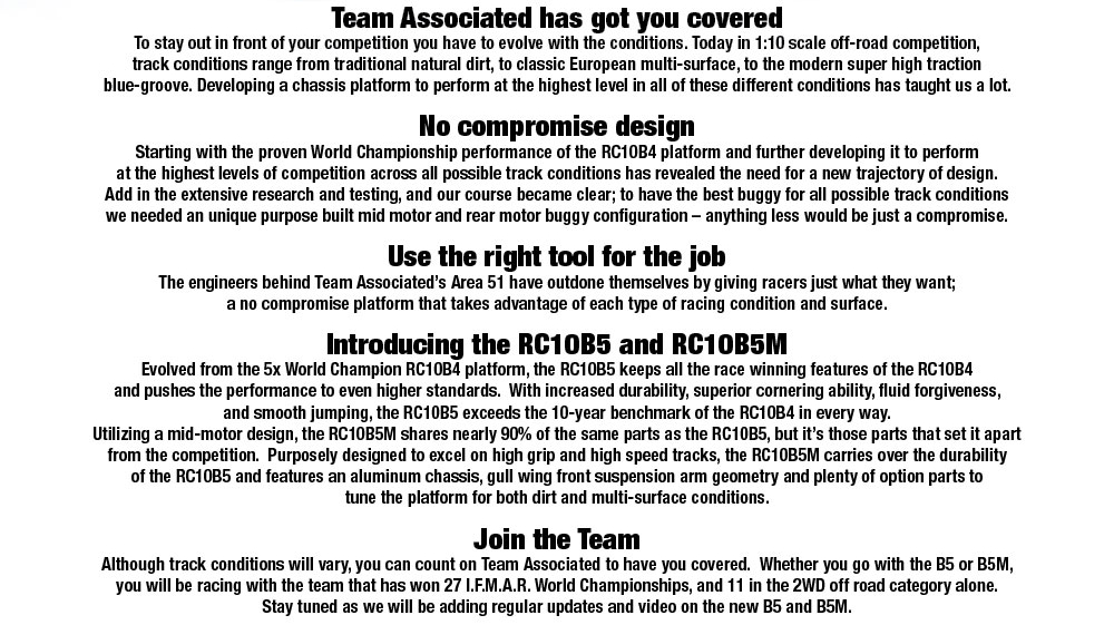 Being the biggest and most successful manufacturer in the 1/10th scale offroad car market, Team Associated is the last of the big companies to release a new car and I’m willing to bet they learned a lot from all of the the other companies’ mistakes along with their own endeavors with the Centro conversion. It was a brilliant move on AE’s part to partner up with CML so they basically had a “prototype” mid motor platform to learn from and not having to play with the stigmas of “prototype”. It didn’t have to be under wraps! With the entire team running the C4.2, they were able to get feedback at the highest level of competition and throughout the course of that partnership, we saw numerous upgrades for the C4.2 platform. With that said, I can’t wait for the B5M as I think AE’s advantage is going to pay off in their mid motor design and the fact that it’s a dedicated design also heightens the appeal. Also, with the B5 rear motor as said to be rumored to be “better in every way” than it’s predecessor is BOLD statement as the B4.2 is the most successful car in RC history at the World level.