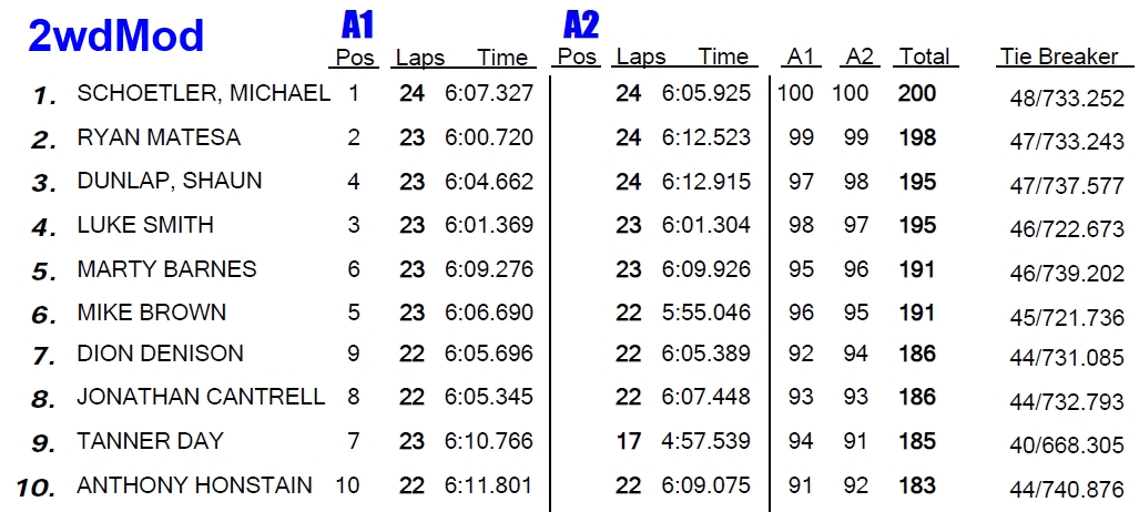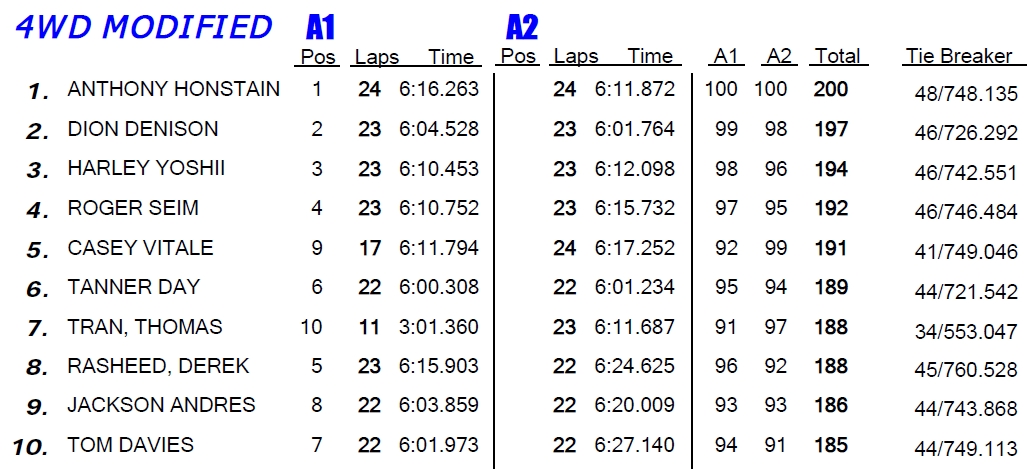 In 4wd Mod buggy, Anthony Honstain was on a mission. Having won A1 by about 4 seconds, 2nd place qualifier, Dion Denison, would pose to be his closest threat. Denison was always close enough to capitalize if Honstain made a mistake, but mistake free Honstain would wrap up A1 in full control. A2 would be much of a repeat, but this time Honstain would improve upon his A1 time by going 5 seconds faster. Once again, Denison and his B44.2 lingered but could not close the gap enough to mount an attack. Team Associated’s young talent, Harley Yoshii would take 3rd on the podium with fast, consistent finishes.
