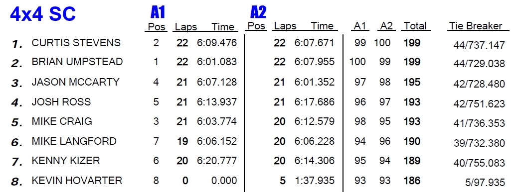 4×4 SC was a great battle between Curtis Stevens and Brian Umpstead. A1 went to TQ Brian Umpstead by a comfy 7 seconds plus. A2 would be a whole different story. Having a horrible start, Umpstead fell back to dead last after the 1st lap. Curtis Stevens would take over the lead and was making a mad dash for the finish line. Like a surgeon, Umpstead would cut his way through traffic and with 2 laps to go, he would reel in and catch the leader and put Stevens under immense pressure! On the last lap Umpstead would give it all he had and crossing the line, it would be Curtis Stevens taking the win by .3 seconds! By winning A2, he would take the tie breaker and win the overall. Great race guys!