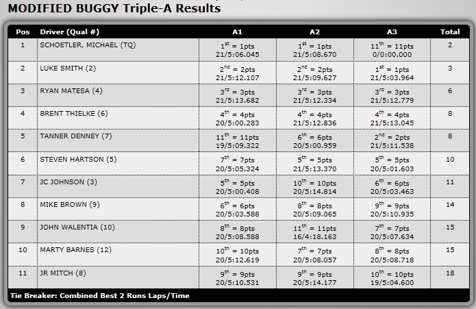 A3 – Having cleaned up and only needing 2 races, Michael Schoettler would be able to watch from the sidelines as he cheered on his teammates. Luke was on a mission and took the bull by the horns and never let go. With a minute gone, Brent Thielke would make a hard charge from 6th on the grid and move into 2nd early in the race as racers would battle traction rolling at the end of the sweeper. Recovering from an early mistake that sent him backwards in the pack, Kyosho’s Ryan Matesa would eventually drive his way back and start his attack on Thielke. Within a few laps, Thielke would go too deep in the sweeper that allowed Matesa to make the pass on the inside. The two drivers would have an incidental ‘get together’ which allowed Tanner Denney to slip into 2nd. The order would remain the same with Luke taking the win in A3, Tanner in 2nd, and Matesa 3rd.