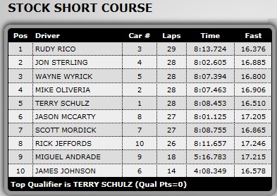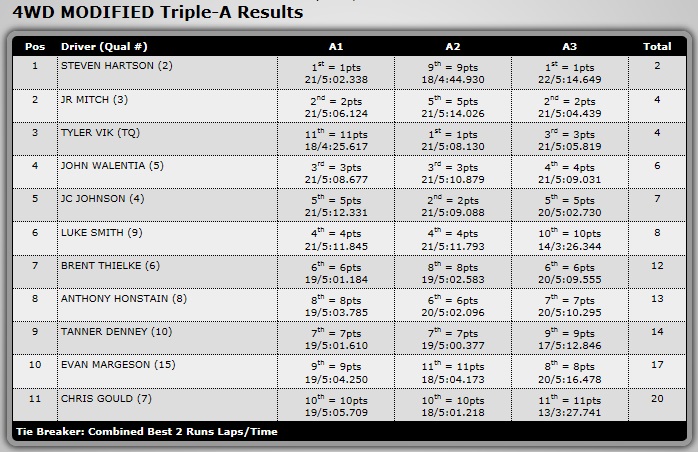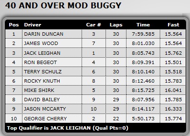 Known as the “Gentlemen’s race” the top 7 drivers were all on the same lap! Leading the race on the last lap, Darin Duncan would actually dump on the track (I think he forgot to charge his pack). As you can see from the time sheet above, he actually cross the line with .4 seconds to spare giving him that extra lap that no one was able to get! 31 laps but the last lap was uncompleted! Great job “Double D” and saved by the bell!! Also great racing by James Wood in 2nd and Jack Leighan in 3rd!
