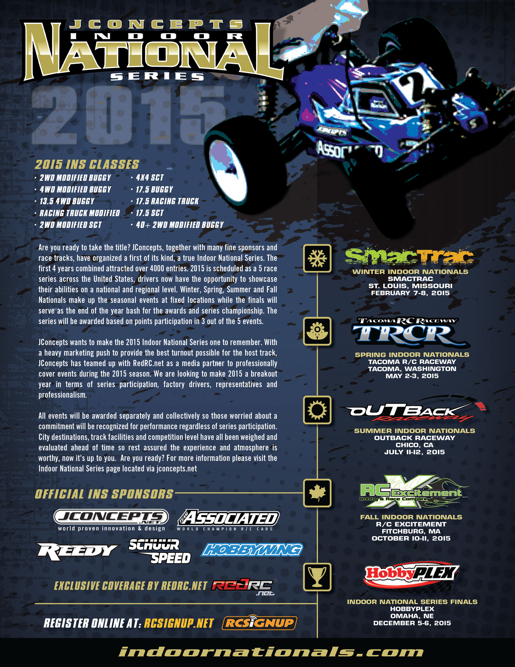 It’s time! Welcome racers and RC enthusiasts to the 2015 JConcepts Indoor National Series. It’s back and better than ever with the addition of the 13.5 modified 4wd class to broaden the class range for more competitive racing. From the east coast to the west, this ultra competitive 5 race series makes its way once again to SMACTRAC in St. Louis, Missouri for round 1 of the highly anticipated 2015 JConcepts INS.