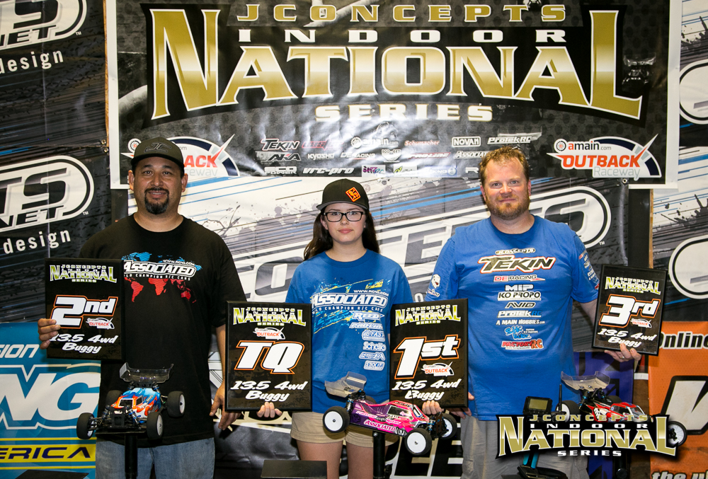Other notable finishes was Team Associated’s Kamyrn Ayers taking the win in 13.5 4wd buggy. She was able to pull away from the very start and build a comfortable gap early on and cruise to the win while making it look good. Team Associated’s Eddie Bernal would show his resilience and experience to fight back from early mishaps and claim 2nd place. 4th place qualifier, Tekin team manager Randy Pike would make his way around Dominic Favorito in the closing laps to finish 3rd.